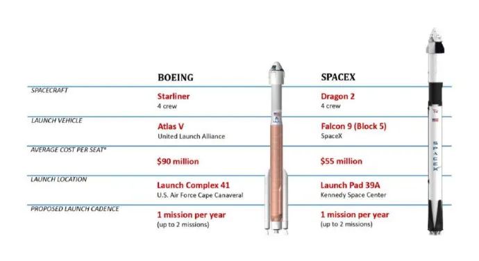 波音拿到的合同为43亿美元,SpaceX为25亿美元,任务均为六次往返任务,每次运送4人,总共运送24名航天员往返。