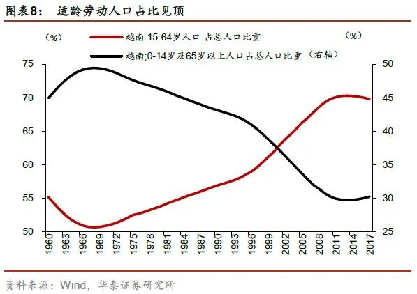 越南的人口数量红利仍在存在,但是已经出现拐点。适龄劳动人口占总人口比重在2012年前后出现下降趋势,抚养比也在2012年前后开始上升。